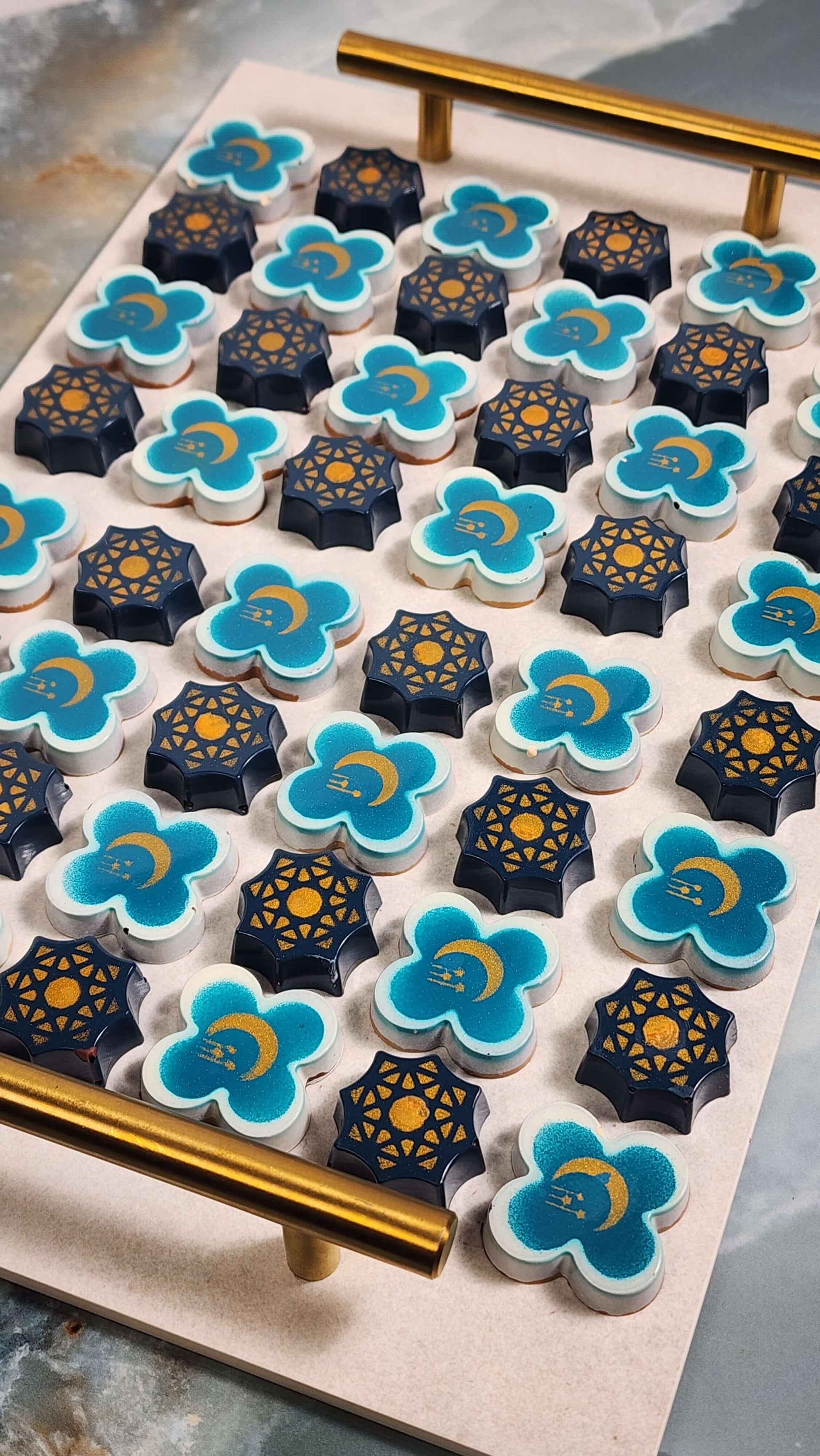 This large box showcases the finest craftsmanship and flavors, featuring a duo of special Arabic flavors presented in an exquisite mosaic style. Delight in every bite and indulge in the opulence of Arabian heritage, elegantly presented atop a genuine marble tray for an added touch of luxury and hospitality.